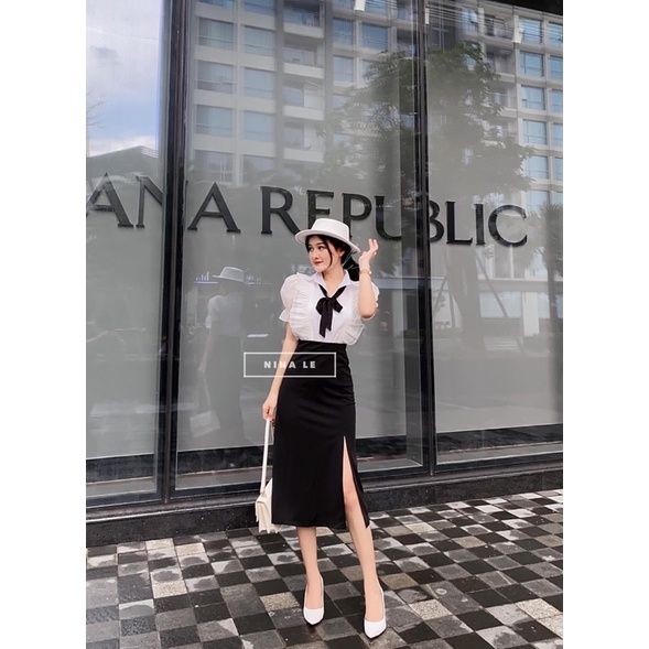 ☑️Bộ sản phẩm bao gồm 1 áo sơ mi trắng phối viền ren nơ cổ thanh lịch, kèm theo chân váy Midi cạp cao xẻ tà