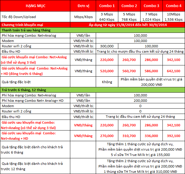 BẢNG GIÁ COMBO INTERNET + TRUYỀN HÌNH CÁP VIỆT NAM