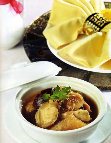 Bóng cá tươi thái lát vừa ăn, đùi gà rửa sạch, chặt miếng. Gân heo thái khúc khoảng 6cm. Bào ngư để nguyên con. Hải sâm rửa sạch, thái miếng vừa ăn. Sò điệp khô ngâm nở. Vi cá rửa sạch. Nấm đông cô rửa sạch, ngâm nở