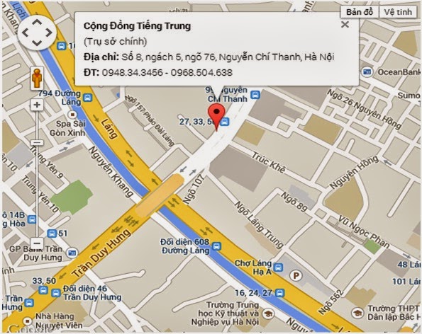 HỌC TIẾNG TRUNG MIỄN PHÍ VỚI NGƯỜI BẢN NGỮ TẠI CỘNG ĐỒNG TIẾNG TRUNGSỐ 8, NGÁCH 5, NGÕ 76, NGUYỄN CHÍ THANH, HÀ NỘI Cộng Đồng Tiếng Trung là gồm giáo viên TRUNG QUỐC sống tại Việt Nam. Sau nhiều năm trải nghiệm và sinh sống ở nhiều nước trên Thế Giới, mong muốn đem đến một phương pháp học mới mà chính các thành viên của Cộng Đồng đã từng trải nghiệm và đã sử dụng thành thạo được nhiều thứ tiếng thành công. Cộng Đồng Tiếng Trung gồm hầu hết các giáo viên Trung Quốc có thể sử dụng thành thạo từ hai đến ba thứ tiếng ( Tiếng Việt , Tiếng Anh, Tiếng Trung ) điều đó đem lại cho các bạn khi học Tiếng Trung không phải lo lắng về rào cản ngôn ngữ khi học tập một thứ tiếng mới.Với mong muốn tạo điều kiện cho các học viên có nhu cầu học tiếng trung cải thiện khả năng phát âm khi giao tiếp với người nước ngoài. CỘNG ĐỒNG TIẾNG TRUNG mở các lớp học phát âm miễn phí với người bản ngữ và các lớp học thử vào các ngày chủ nhật, thứ 2 và thứ 3 hàng tuần..Ngoài ra, các thành viên tham gia sẽ được đăng ký để tham dự các buổi giao lưu về văn hóa, ngôn ngữ, nấu ăn các món đặc sản Trung – Việt, hoạt động ngoại khóa…  Đặc biệt, với mục đích tạo ra một cộng đồng tiếng trung lớn nhất tại Hà Nội ngoài việc là một nơi mà mọi người có thể luyện tập và thực hành tiếng trung, CỘNG ĐỒNG TIẾNG TRUNG còn là nơi kết nối các cổng việc làm về tiếng Trung cho các học viên có nhu cầu và có thành tích học tập tốt, giao tiếp tốt để làm phiên dịch với các tổ chức và Công ty Trung Quốc lien kết với CỘNG ĐỒNG TIẾNG TRUNG sang Việt Nam tìm hiểu, nghiên cứu thị trường tạiViệt Nam.